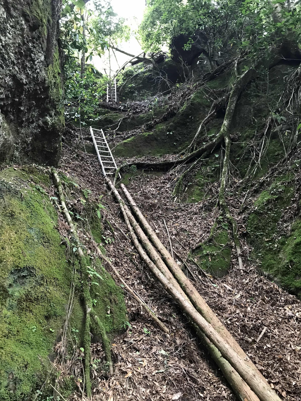 アルミのハシゴ下にある木材のうち2本を固定して、残りの1本+αをチェンソーで切り、ハシゴの形に固定していく。部品のある限り、雨が降る前に。
